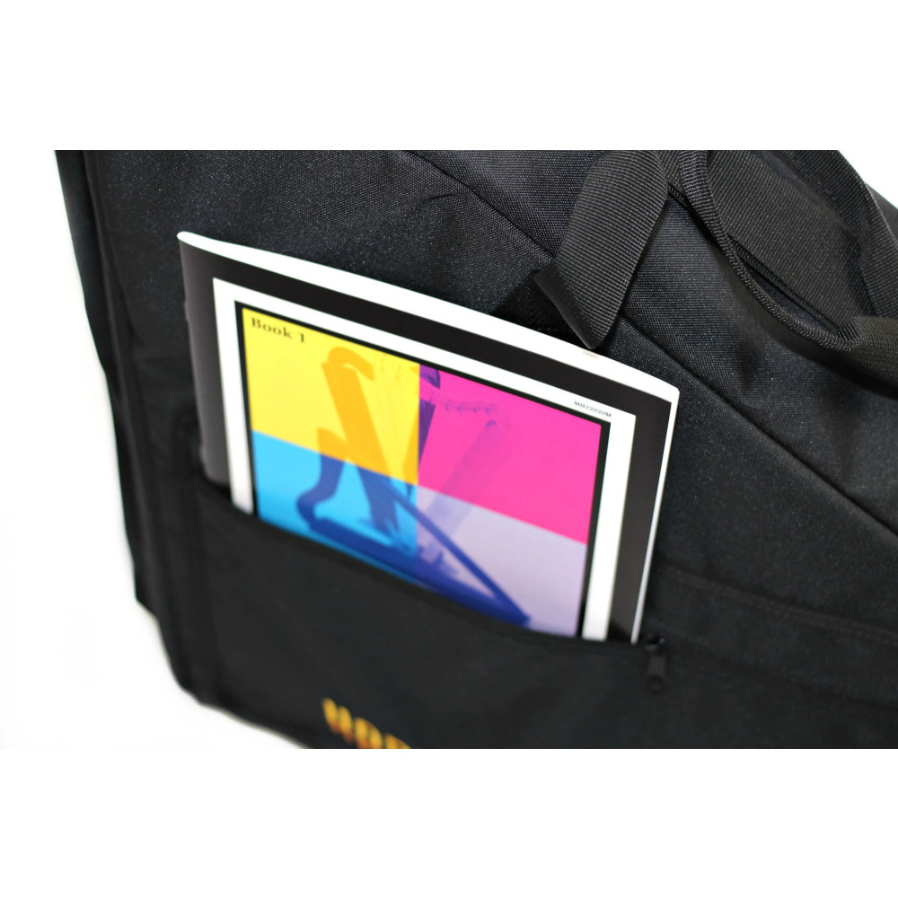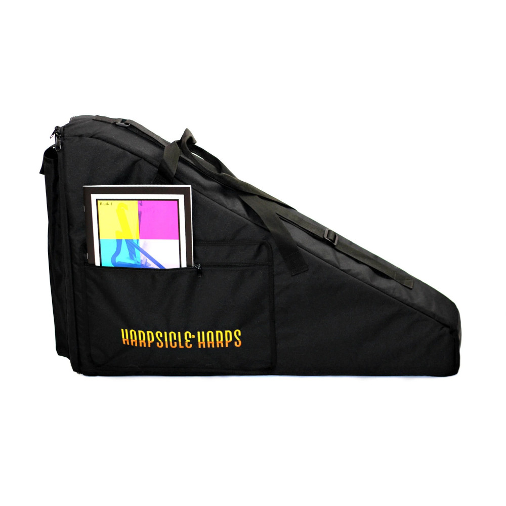 Fabricada con materiales resistentes y acolchado interno de alta calidad, esta funda incorpora cremalleras duraderas, asas de transporte y una correa para el hombro que facilitan su manejo. Además, cuenta con un bolsillo frontal para afinadores u otros accesorios y un compartimento especial en el borde superior, diseñado específicamente para llevar el Harpsicle® Stick. Una solución robusta y práctica para músicos en constante movimiento.
