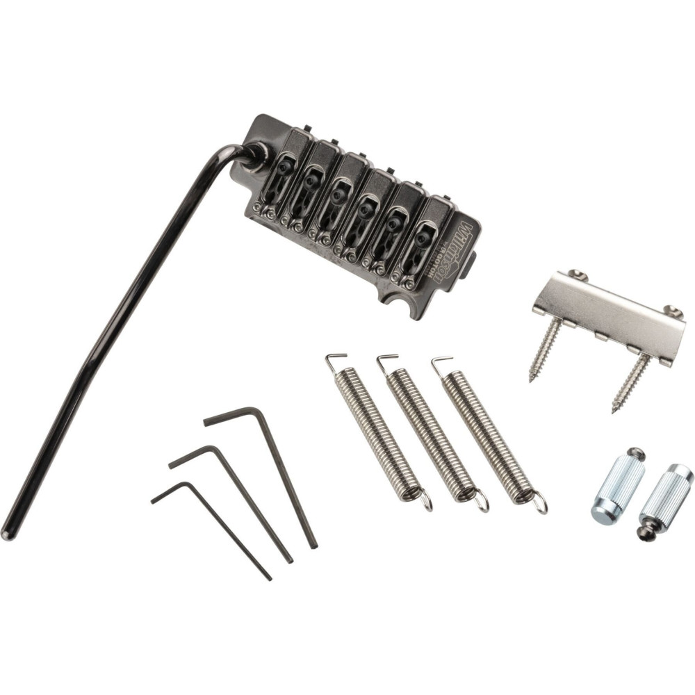 Equipa silletas de acero Wilkinson que optimizan la transmisión de la vibración, realzando la resonancia y el sustain del instrumento. El bloque de zinc contribuye a una respuesta equilibrada, mientras que el sistema de pivote con perno de bloqueo de dos puntos garantiza una acción de trémolo suave y estable. El espaciado entre cuerdas de 10,8 mm permite una ejecución cómoda y precisa. Fabricado en Japón, este puente ofrece ingeniería de alta calidad y viene completamente equipado con brazo de trémolo, resortes, garra con tornillos, llave hexagonal y anclajes, listo para una instalación profesional.